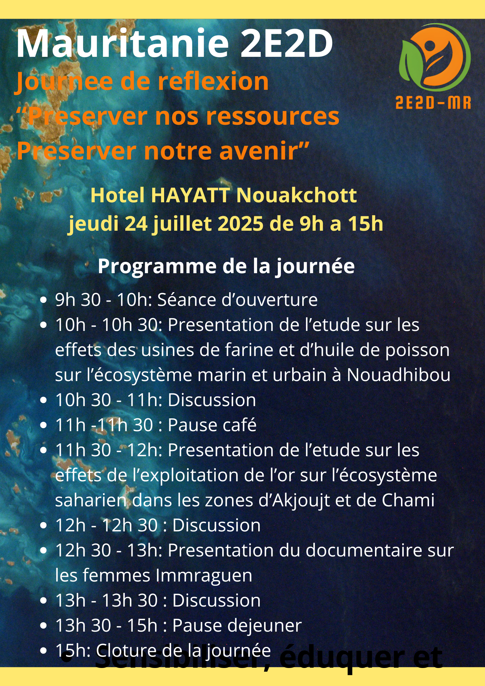 MAURITANIE 2E2D organise des journées de reflexion sur le thème “Preserver nos Ressources Preserver notre Avenir” les 24 et 25 Juillet 2025 à Nouakchott, Hôtel HAYATT.